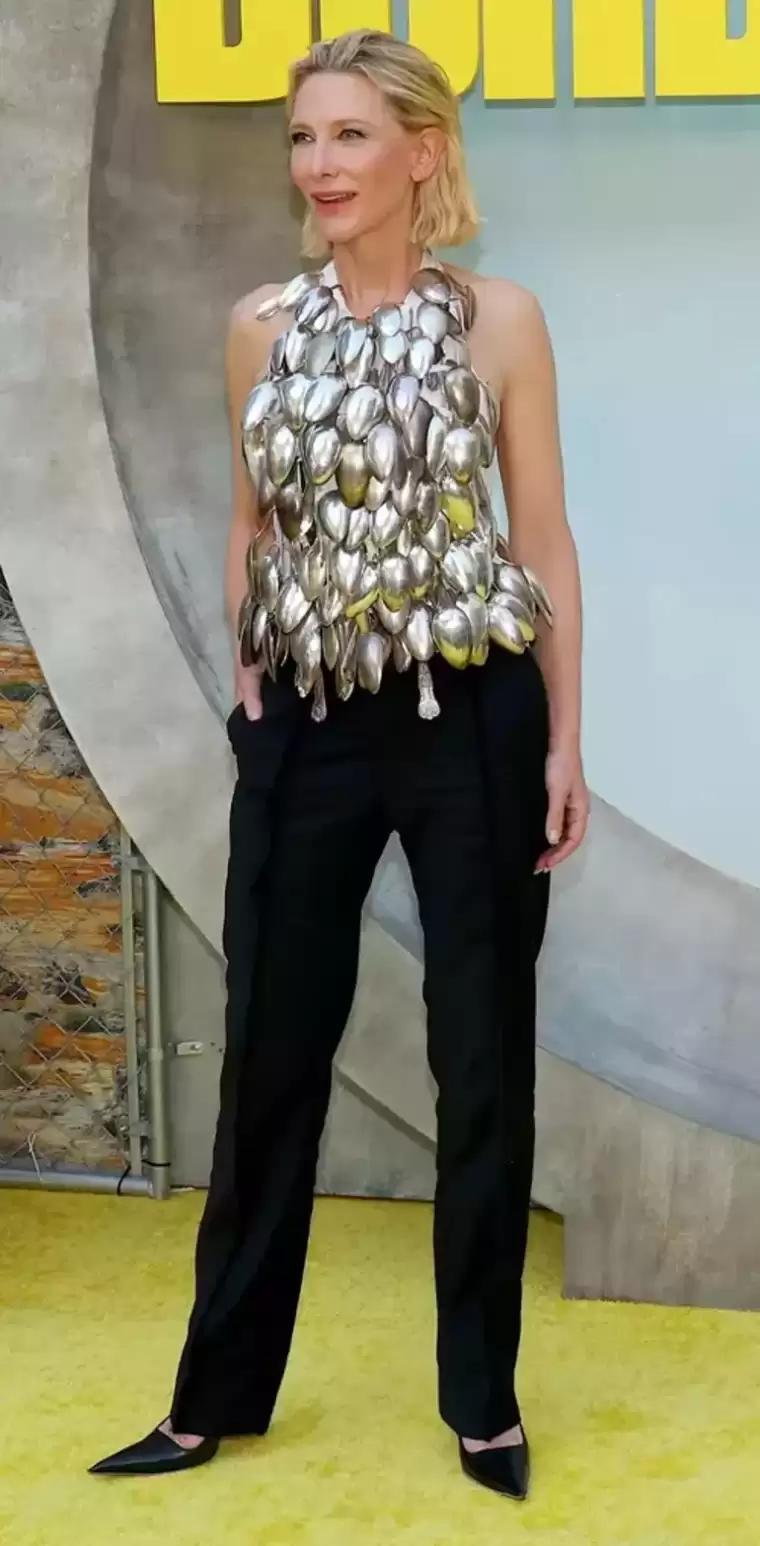Larsson, Blanchett'in siyah bir pantolon ve sivri burunlu ayakkabılar ile kombinlediği bluzu için, her biri Stockholm ve çevresinden temin edilen 102 kaşık kullandı.