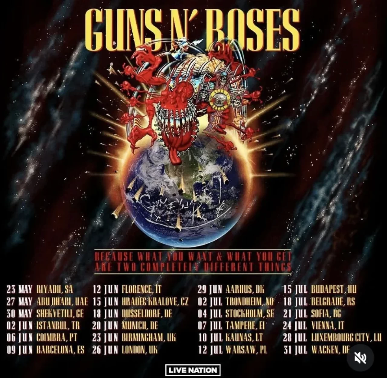 Guns N’Roses, Avrupa turnesi kapsamında 2 Haziran 2025'te İstanbul Beşiktaş TÜPRAŞ Stadyumu'nda konser verecek.