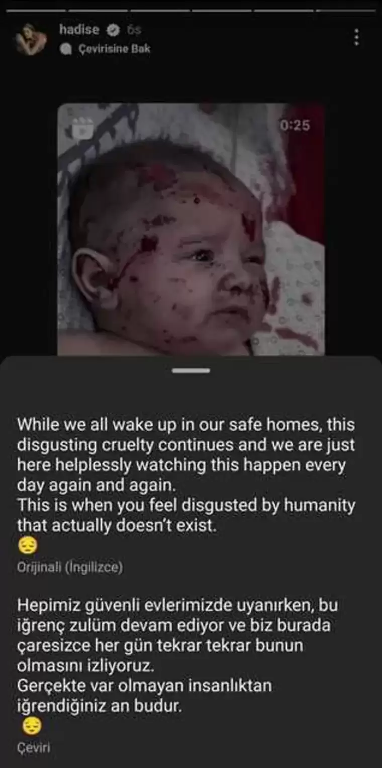 Hadise, yayınladığı o videoya; "Hepimiz güvenli evlerimizi uyanırken bu iğrenç zulüm devam ediyor ve biz burada çaresizce her gün tekrar tekrar bunun olmasını izliyoruz. Gerçekten var olmayan insanlıktan iğrendiğiniz an budur" notunu düştü.