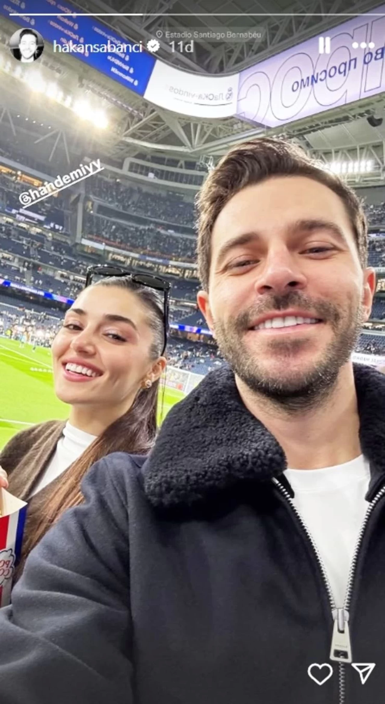 Hakan Sabancı, Hande Erçel ile UEFA Şampiyonlar Ligi play-off turu rövanşında Real Madrid - Manchester City maçını seyretmek üzere Santiago Bernabéu Stadyumu’ndan fotoğraf paylaştı. Bu kareyle çift, ayrılık iddialarını da boşa çıkarmış oldu.