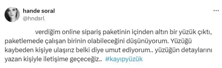Ünlü bir markanın internet sitesinden alışveriş yapan oyuncu, gelen paketin içerisinde altın bir yüzük buldu. Hande Soral, X hesabından yüzüğün sahibini bulmak için harekete geçti.