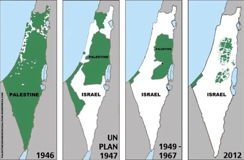 1947'de Birleşmiş Milletler'in sunduğu Taksim Planı'nın Araplar tarafından reddedildiği, sonrasındaysa İsrail'in Arap ülkelerine karşı verdiği savaşları kazanarak bu topraklarda egemenliğini sağladığı öne sürüldü.