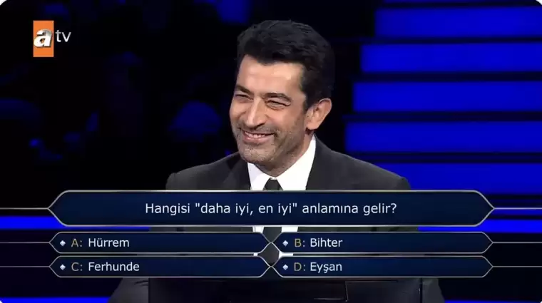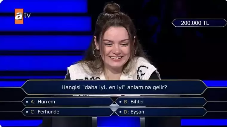 200 bin TL değerindeki soruda "daha iyi, en iyi" anlamına gelen isim soruldu. Üstelik tüm şıklar ünlü Türk dizilerinde yer alan karakterlerin isimleriydi.