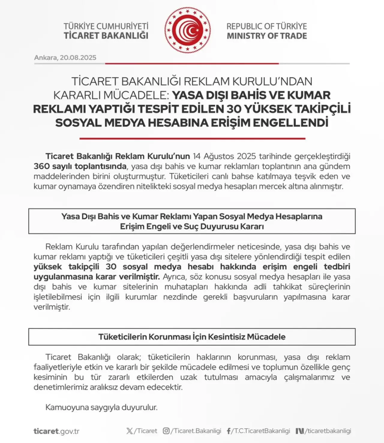 Bakanlıktan yapılan açıklamada, "Reklam Kurulu tarafından yapılan değerlendirmeler neticesinde, yasa dışı bahis ve kumar reklamı yaptığı ve tüketicileri çeşitli yasa dışı sitelere yönlendirdiği tespit edilen yüksek takipçili 30 sosyal medya hesabı hakkında erişim engeli tedbiri uygulanmasına karar verilmiştir." denildi.