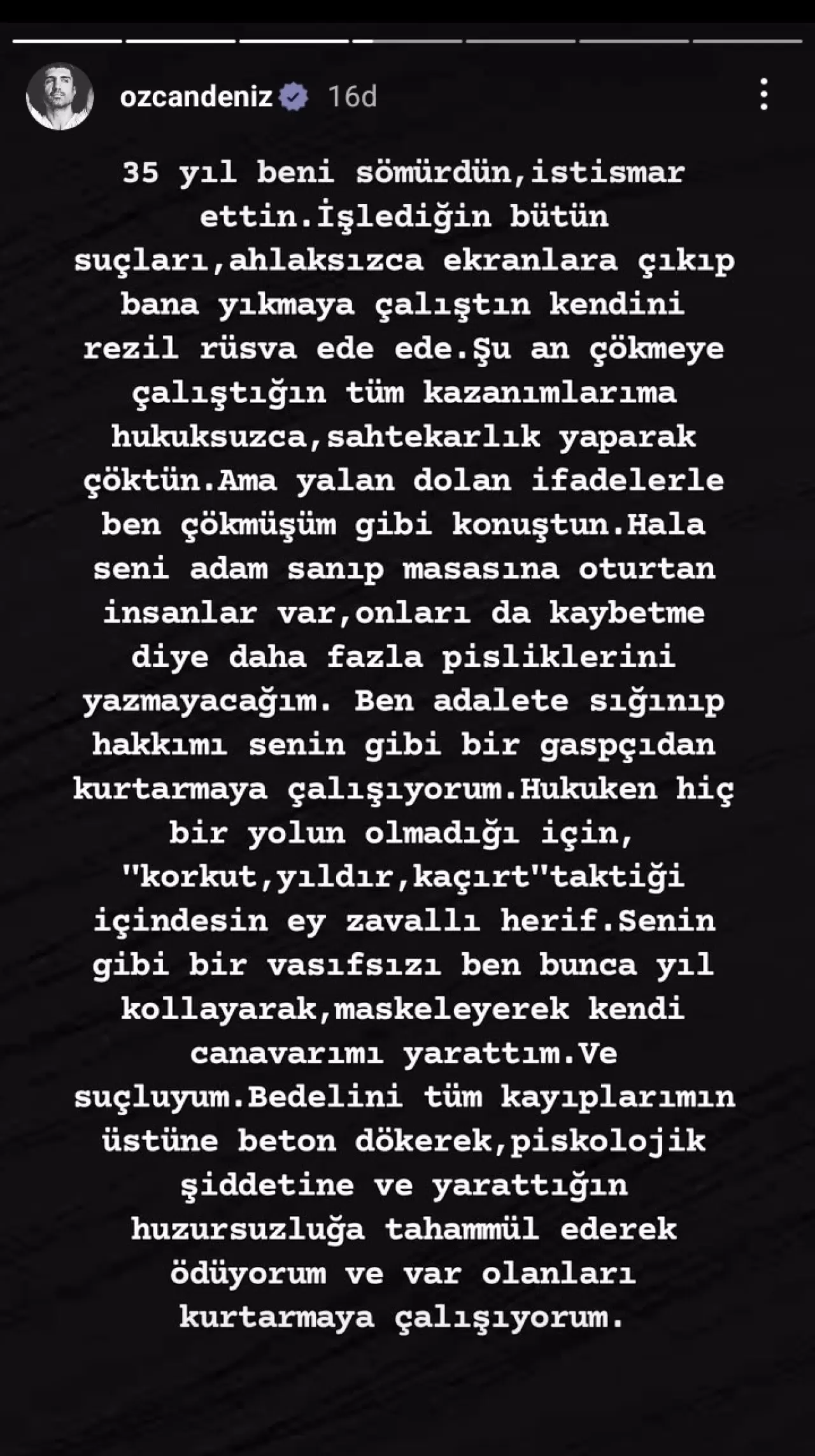 Açıklamanın sonunda, hayranlarına ve kamuoyuna da seslenen Özcan Deniz, kimseye zarar vermek istemediğini ancak artık sessiz kalamayacağını belirtti. Sözlerini “Gerçekler bir gün ortaya çıkacak” diyerek noktalayan Deniz’in bu çıkışı, sosyal medyada da geniş yankı uyandırdı.