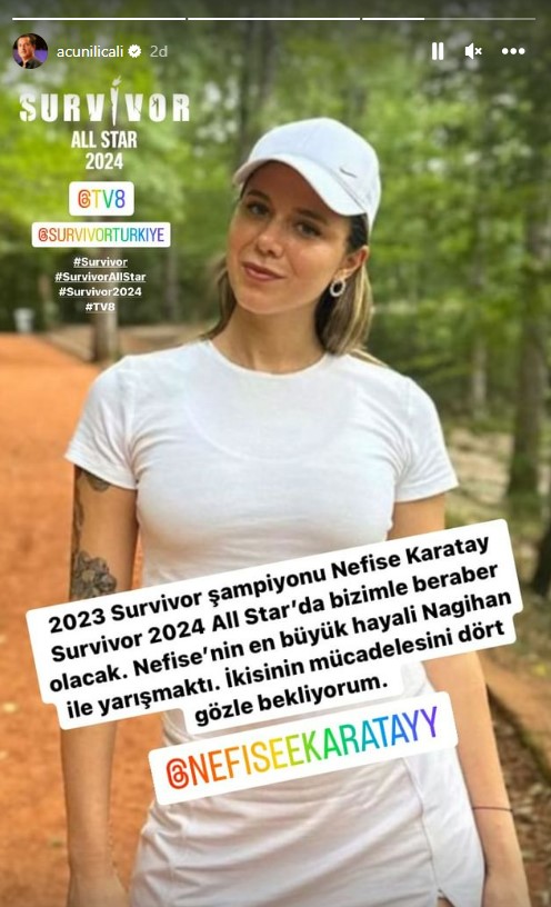 Instagram hesabından her gün bir ismi açıklayan Acun Ilıcalı, bugün de Survivor 2023 şampiyonu Nefise Karatay'ın kadroya dahil olduğunu duyurdu. Karatay'ın en büyük hayalinden bahseden Acun Ilıcalı, "2023 Survivor şampiyonu Nefis Karatay Survivor 2024 All Star'da bizimle beraber olacak. Nefise'nin en büyük hayali Nagihan ile yarışmaktı. İkisinin mücadelesini dört gözle merak ediyorum" ifadelerini kullandı.