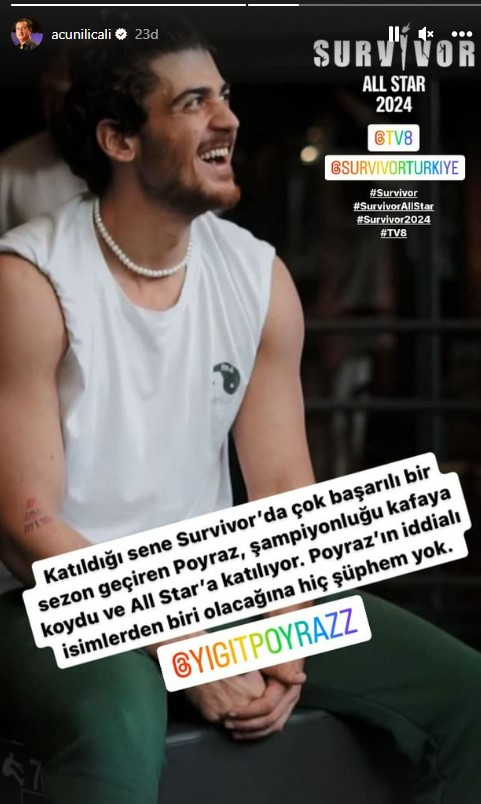 Instagram hesabından her gün bir ismi açıklayan Acun Ilıcalı, bugün de 2021 Survivor'da yarışan Yiğit Poyraz'ın adını duyurarak "Katıldığı sene Survivor'da çok başarılı bir sezon geçiren Poyraz, şampiyonluğu kafaya koydu ve All Star'a katılıyor. Poyraz'ın iddialı isimlerinden biri olacağına hiç şüphem yok" ifadelerini kullandı.