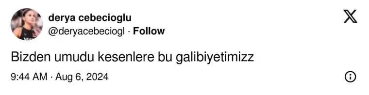 Derya Cebecioğlu, maç sonu yaptığı paylaşımda eleştirilere cevap verdi. Tüm takımın turnuva boyu yapılan eleştirilerden etkilendiği gözlenirken, Derya "Bizden umudu kesenlere bu galibiyetimiz" paylaşımı yaptı.