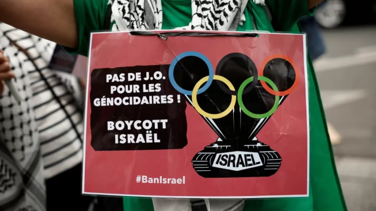 "Gazze'ye özgürlük, Filistin'e özgürlük", "İsrail'e boykot" sloganları eşliğinde, "Soykırımcılar için olimpiyatlar yok", "İsrail'e soykırım altın madalyası" yazılı pankartlar taşıyan göstericiler, İsrail'in olimpiyatlarda yer almaması çağrısı yaptı.