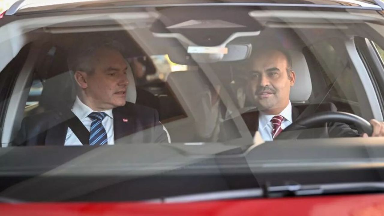 Kacır direksiyon başına geçerken, Nehammer de yanına oturdu. Bakan Kacır, Togg'u ilk kez deneyimleyen Nehammer'e akıllı cihazın özellikleri hakkında bilgi verdi.