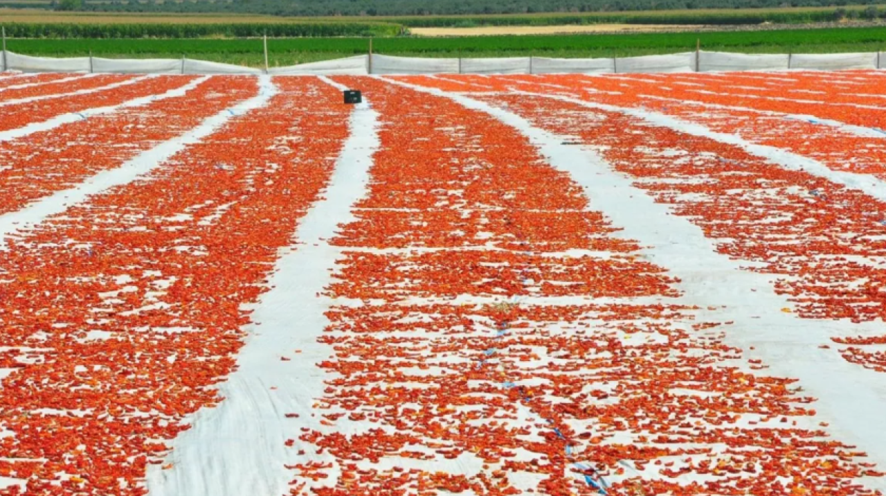 Türkiye'de sanayi tipi domates üretiminde 2'nci sırada yer alan, kurutulmuş domatesin de önemli merkezlerinden Manisa'nın Saruhanlı ve Turgutlu ilçelerinde hasat edilen ürünler, kurutulmak için tarlalara serilmeye başlandı. Tarlada işçilerin topladığı domatesler, makineyle güneşe seriliyor. Tuzlama işleminin ardından 1 hafta boyunca kurumaya bırakılan domatesler, daha sonra tesislere getirilerek işleniyor. İhracatçı firmalara kilogramı 35 ile 40 TL arasında verilen kurutulmuş domatesler, ABD başta olmak üzere İngiltere, İtalya, Almanya ve Rusya'ya gönderiliyor. Bu yıl kurutulmuş domateste 15 bin tonluk ihracat hedefleniyor.