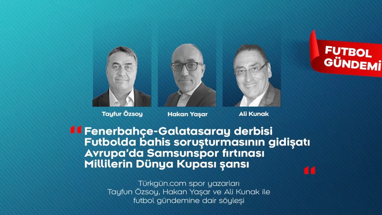 Türkgün.com spor yazarları Tayfun Özsoy, Hakan Yaşar ve Ali Kunak; Süper Lig’de oynanacak Fenerbahçe-Galatasaray derbisi, Türk futbolundaki bahis soruşturması, Samsunspor’un UEFA Konferans Ligi performansı ve A Milli Takım’ın Dünya Kupası’na katılım şansı ilgili sorularımızı yanıtladı.