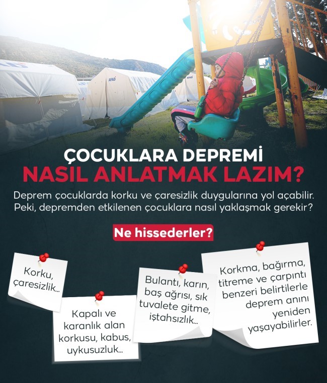 Yani kabaca yer kabuğunda nasıl bir değişiklik olduğu, bu değişikliğin dünyada ne kadar sık olduğu, hangi ülkelerde olduğu, ülkemizde daha önce de olduğu ve yaraların sarıldığı gibi ve depremin kabaca, basit -hayat bilgisi kitabından da bakabilir aileler- tanımının yapılması faydalı olur. Çünkü çocuklar hastalıkları da bu tip olayları da biyolojik ya da mekanik yönleriyle anlarlar.”