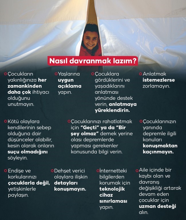 “Çocukların algılamaları ve etkilenme düzeyleri çok farklı. Tabii ki burada çocukların yaşlarına uygun açıklama yapmak lazım. Ergenlere bizlerin anladığı gibi anlatmak yerinde olur. Okul çağındaki çocuklara depremin açıklamasını yapmak doğru olacaktır çünkü çocuklar farklı şeyler anlarlar.
