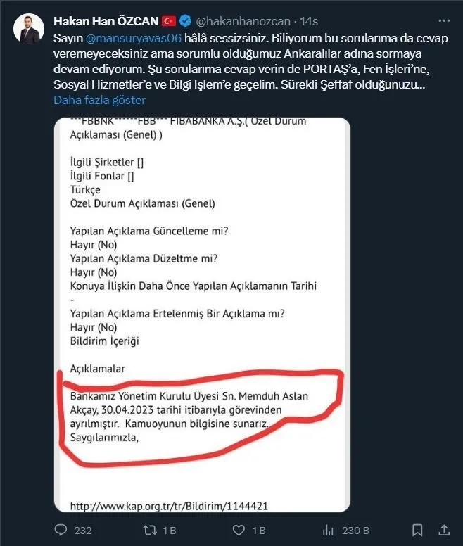 "Sayın Mansur Yavaş hâlâ sessizsiniz." diyen AK Parti Ankara İl Başkanı Hakan Han Özcan, "Biliyorum bu sorularıma da cevap veremeyeceksiniz ama sorumlu olduğumuz Ankaralılar adına sormaya devam ediyorum. Şu sorularıma cevap verin de PORTAŞ'a, Fen İşleri'ne, Sosyal Hizmetler'e ve Bilgi Işlem'e geçelim. Sürekli 'Şeffaf' olduğunuzu iddia ediyorsunuz ya onun için ısrarla soruyorum; Ankaralının parasını yok eden bankacılık işlemlerini yaparken, aklına muhtaç olduğunuz, özel bankanın yönetim kurulu üyesi meşhur finans uzmanınız Memduh Aslan Akçay'a hangi hakla belediyeyi yönettirdiniz, talimatlar yağdırmasına, Ankaralının parası hakkında karar vermesine nasıl müsaade ettiniz?