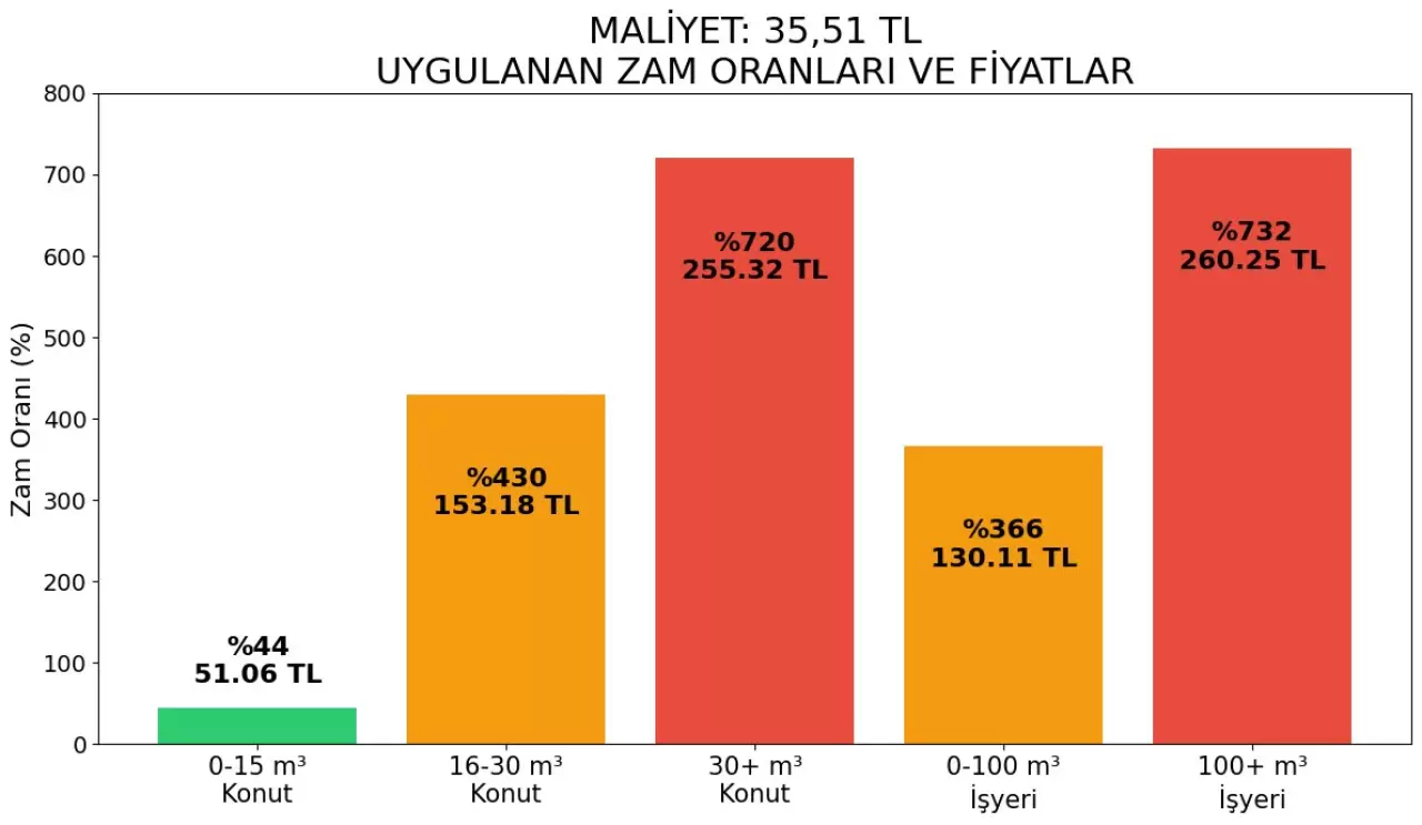 “İdari Mahkeme su maliyetini 35,51 TL olarak belirledi... Ancak uygulanan tarifelere baktığımızda, %700'e varan fiyat artış oranları ve 250 TL'yi aşan fiyatlarla karşılaşıyoruz. Rakamlar açık. Mahkeme bu fahiş fiyat artışlarını iptal etti.” paylaşımı yapan Gökçek, şu grafiği yayınladı.