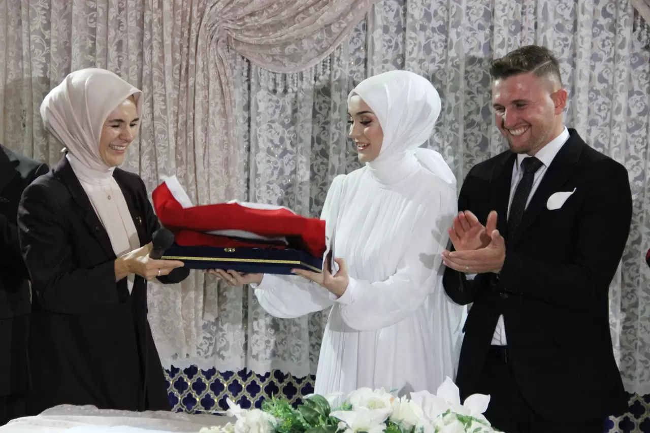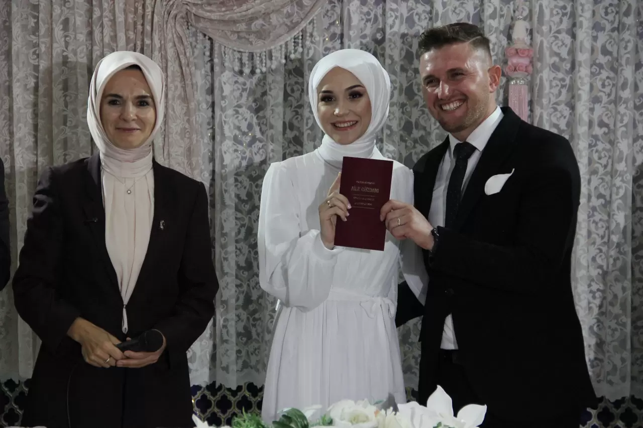 Ben evlilik cüzdanını iksine birden vermek istiyorum. Evliliklilik birlikte inşa edilir, sevgiyle saygıyla yoğurulur. İnşallah hastalıkta, sağlıkta niyetimiz sizin güzel günler görmeniz. Hayatın her alanında bugünü hatırlayarak, aynı saygı çerçevesinde ilerlemenizi temenni ediyoruz. Bu kadar güçlü şahitleriniz var. İnşallah sizler de bu şahitlerin yanında, evlilikte birbirinize daha güçlü sarılırsınız. Bugün Aile Yılı, sizlerin yanında olmayı sürdüreceğiz. Rabbim, birliğinizi, beraberliğinizi daim eylesin" dedi.