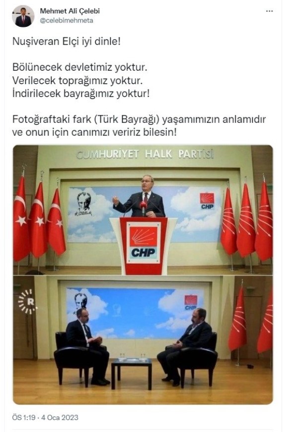 CHP Genel Başkanı Kemal Kılıçdaroğlu'nun başdanışmanı Nuşirevan Elçi'nin Erbil merkezli Rudow'a verdiği röportajda özerklik iması ve Türk bayrağının kaldırılması olayı ardından AK Parti İzmir Milletvekili Mehmet Ali Çelebi, Elçi'ye tepki gösterdi. Çelebi, "Nuşiveran Elçi iyi dinle! Bölünecek devletimiz yoktur. Verilecek toprağımız yoktur. İndirilecek bayrağımız yoktur! Fotoğraftaki fark (Türk Bayrağı) yaşamımızın anlamıdır ve onun için canımızı veririz bilesin!" dedi