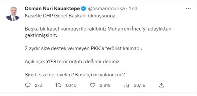 "Kasetle CHP Genel Başkanı olmuşsunuz. Başka bir kaset kumpası ile rakibiniz Muharrem İnce'yi adaylıktan çektirmişsiniz. 2 aydır size destek vermeyen PKK'lı terörist kalmadı. Açık açık YPG terör örgütü değildir dediniz. Şimdi size ne diyelim? Kasetçi mi yalancı mı?"