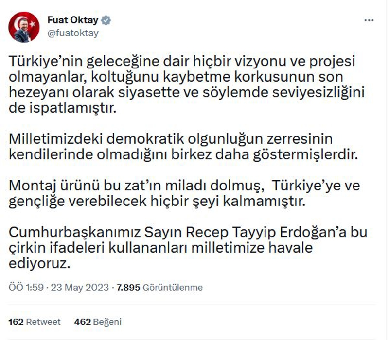 Kılıçdaroğlu'nda demokratik olgunluğun olmadığını belirten Oktay, "Türkiye'nin geleceğine dair hiçbir vizyonu ve projesi olmayanlar, koltuğunu kaybetme korkusunun son hezeyanı olarak siyasette ve söylemde seviyesizliğini de ispatlamıştır. Milletimizdeki demokratik olgunluğun zerresinin kendilerinde olmadığını bir kez daha göstermişlerdir. Montaj ürünü bu zat'ın miladı dolmuş, Türkiye'ye ve gençliğe verebilecek hiçbir şeyi kalmamıştır. Cumhurbaşkanımız Sayın Recep Tayyip Erdoğan'a bu çirkin ifadeleri kullananları milletimize havale ediyoruz." dedi.