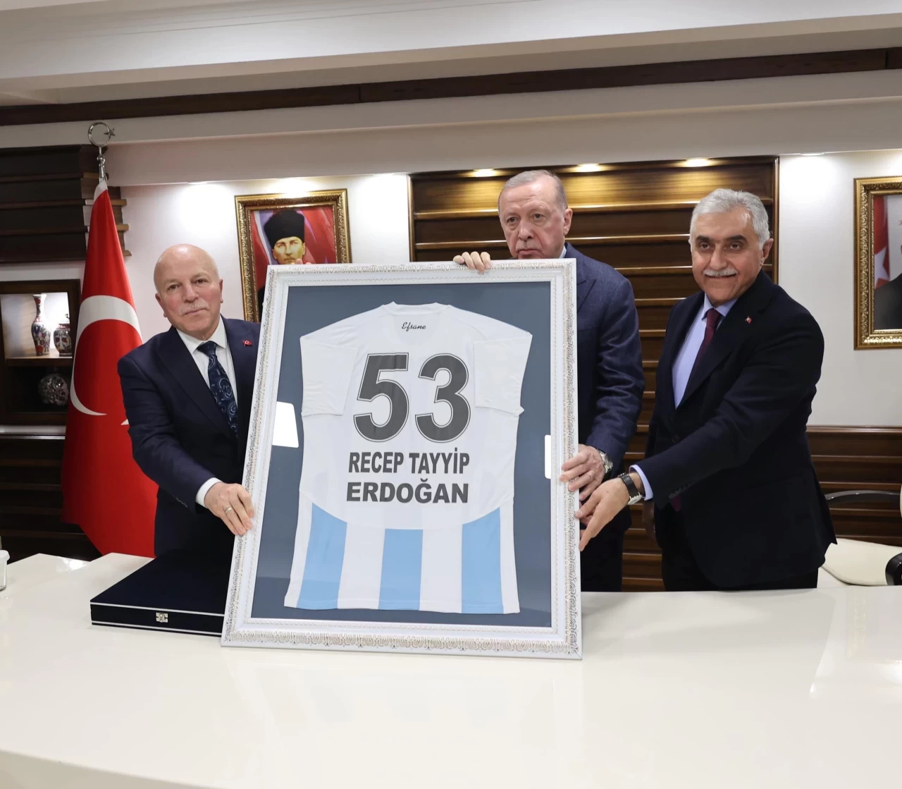 Cumhurbaşkanı Recep Tayyip Erdoğan, Bilim Erzurum’da düzenlenen Gençlik Buluşması'na katıldıktan sonra Büyükşehir Belediyesi’ni ziyaret etti. Başkan Mehmet Sekmen, Cumhurbaşkanı Erdoğan’a kentteki yatırımlarla ilgili brifing sundu, 53 sırt numaralı Erzurumspor forması hediye etti. Sekmen, ziyaretle ilgili şu açıklamayı yaptı: