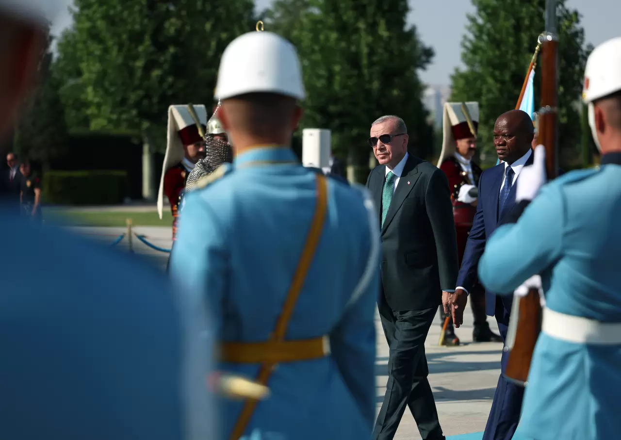 Oligui Nguema, Muhafız Alayı Tören Kıtası'nı "Merhaba asker" diyerek selamladı. Cumhurbaşkanı Erdoğan ve Oligui Nguema birbirlerine heyetlerini takdim etti.