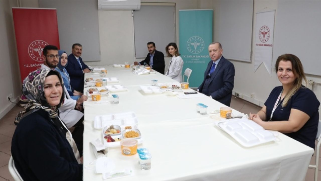 Burada sağlık çalışanlarıyla orucunu açan Erdoğan'a, Sağlık Bakanı Fahrettin Koca da eşlik etti.