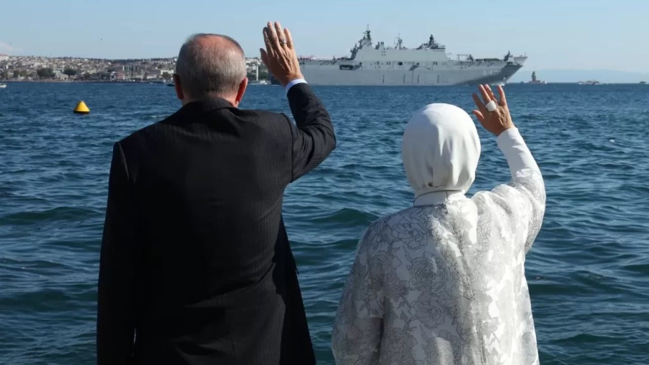 Cumhurbaşkanı Erdoğan ile eşi Emine Erdoğan'ın filoyu selamlama anına ilişkin fotoğrafa da paylaşımda yer verildi.