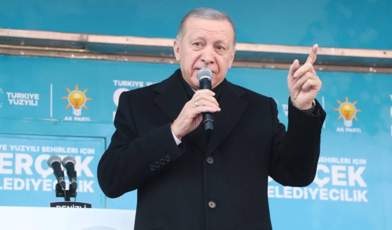 Cumhurbaşkanı ve AK Parti Genel Başkanı Recep Tayyip Erdoğan, seçim programı kapsamında Denizli'de AK Parti'nin aday tanıtım toplantısına katıldı. 29 Ekim Bulvarı Özay Gönlüm Meydanı'nda toplanan kalabalığa hitap eden Erdoğan, Denizli'de bulunmaktan duyduğu memnuniyeti dile getirip, Özay Gönlüm'ün 'Asmam Çardaktan' türküsünden 'Asmam yıkıldı, suyu sıkıldı. Bugün koca kızı görmedim, canım sıkıldı' dizeleriyle sözlerini sürdürerek, "Denizli'ye gelip sizlerle kucaklaşmayınca bizim de canımız sıkılıyor" dedi. Erdoğan, 10 aylık hasretin ardından bugün Denizlilerle beraber olduğunu belirtip, 'Mayıs ayındaki seçimlerde Cumhur İttifakı'na; cumhurbaşkanlığında yüzde 44, milletvekilliğinde yüzde 45 oy oranıyla destek verdiniz. Ama bu oy oranlarının aramızdaki muhabbetin seviyesini yansıtmadığına inanıyorum. Denizli'de en az yüzde 50'nin üzerinde oy bekliyoruz. Buna var mıyız? İnşallah 31 Mart'ta bu hedefe ulaşacağız. Eksiklerimizi tamamlayacağız. Mesajlarımızı ulaştıramadığımız insanlarımız varsa bir yolunu bulup, mutlaka onlara ulaşacağız. Ülkemize dair hayal ve hedeflerimizi anlatmaya devam edeceğiz. Cumhur İttifakı'na gönül verenler olarak CHP başta olmak üzere muhalefetten umudunu kesen insanlarımızı da muhabbetle bağrımıza basacağız. Daha fazla koşarak Denizli'de hak ettiğimiz yere mutlaka geleceğiz. Denizli'nin de 'Türkiye Yüzyılı' mücadelesinde bizi yalnız bırakmayacağı kanaatindeyim. Ülkemizi 21 yılda nasıl asırlık demokrasi ve kalkınma atılımlarıyla buluşturduysak, inşallah 'Türkiye Yüzyılı'nın inşası da bize nasip olacak" dedi.
