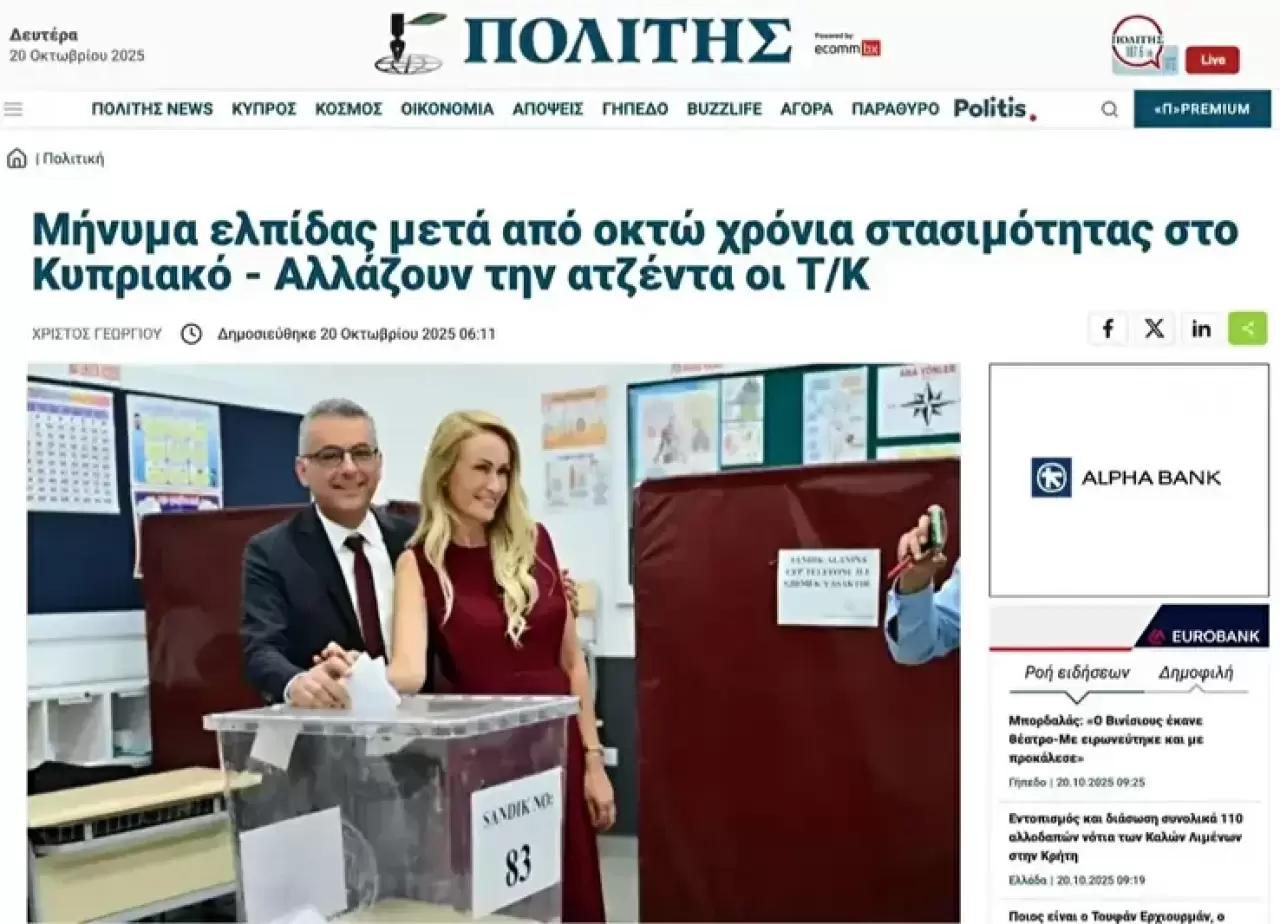 - 1922 yılından bu yana yayın yapan To Vima gazetesi ise seçimlerden duyduğu mutluluğu okurlarına sundu. Gazete, "İşgal altındaki Kuzey Kıbrıs'ta muhalefet adayı Tufan Erhürman, cumhurbaşkanlığı seçimlerinin ilk turunda ezici bir zafer kazanırken, Türkiye Cumhurbaşkanı Recep Tayyip Erdoğan'ın desteklediği Kıbrıs Türk Toplumu Lideri Ersin Tatar ağır bir yenilgi aldı." manşetini attı.