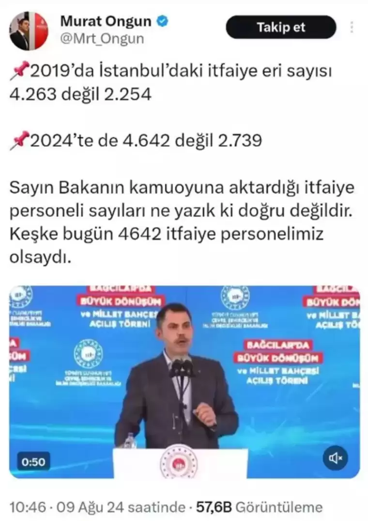 Bakan Kurum'un açıklamasına ilişkin sosyal medya hesabından bir paylaşım yapan İmamoğlu'nun danışmanı Murat Ongun, "Keşke 4 bin 642 itfaiye personelimiz olsaydı" diyerek Kurum'un verdiği rakamların doğru olmadığını iddia etti. Ongun 2019'da İstanbul'daki itfaiye eri sayısının 2 bin 254, 2024'te de 2 bin 739 olduğunu öne sürdü. Ongun'un rakamlarını 2023 İBB personel istihdam sayıları raporu yalanladı. Raporda, Anadolu yakasında 1447, Avrupa yakasında ise 2166 olmak üzere toplam 3 bin 613 itfaiye personeli olduğu belirtildi.