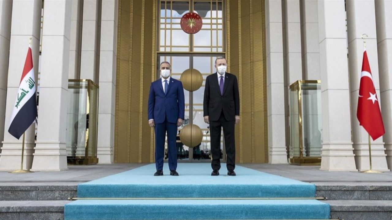İki ülke heyetlerinin takdimi sonrasında Erdoğan ve Kazımi, merdivenlerde Türkiye ve Irak bayrakları önünde gazetecilere poz verdi.