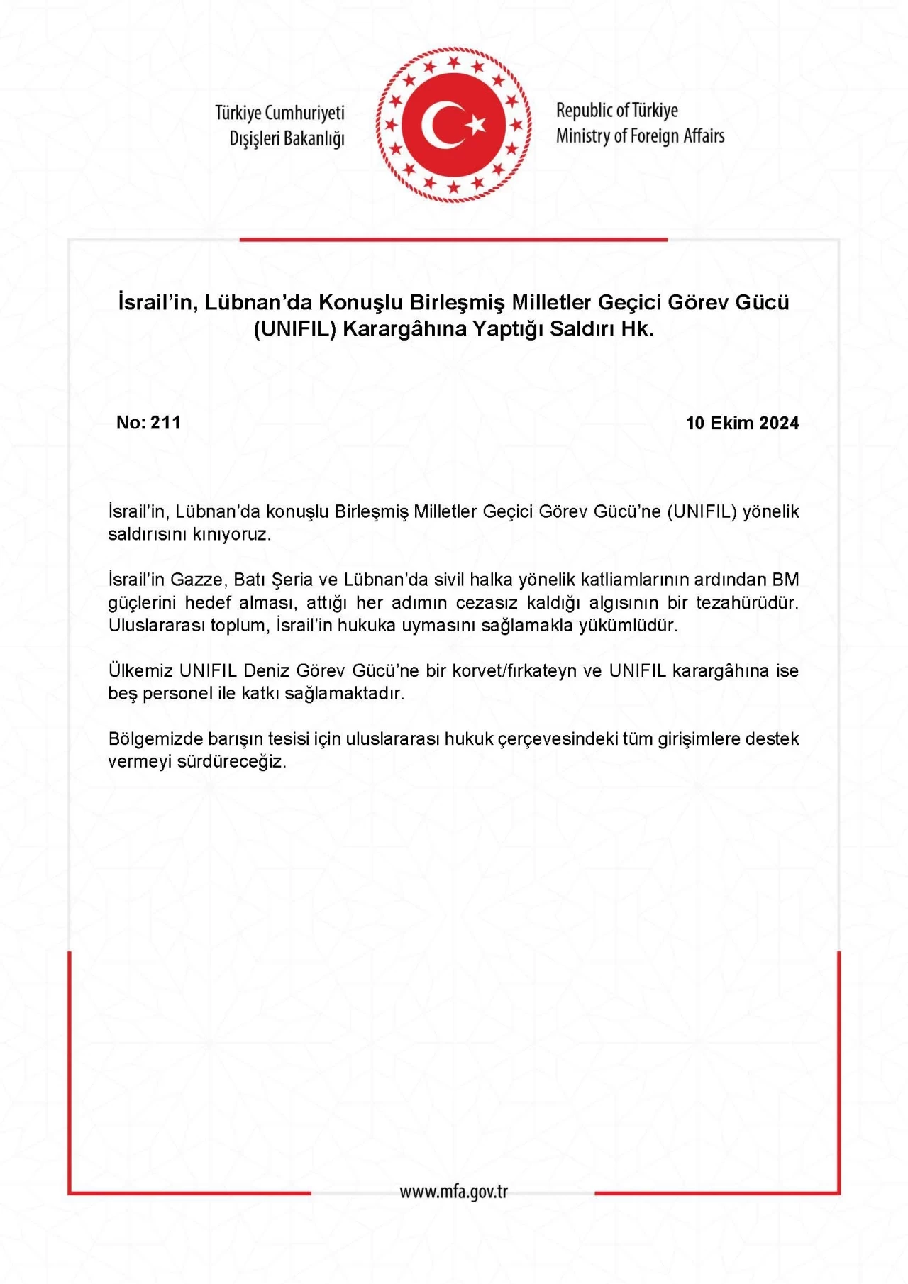 Açıklamada, "İsrail'in Lübnan'da konuşlu Birleşmiş Milletler Geçici Görev Gücü'ne (UNIFIL) yönelik saldırısını kınıyoruz." ifadesi kullanıldı.
