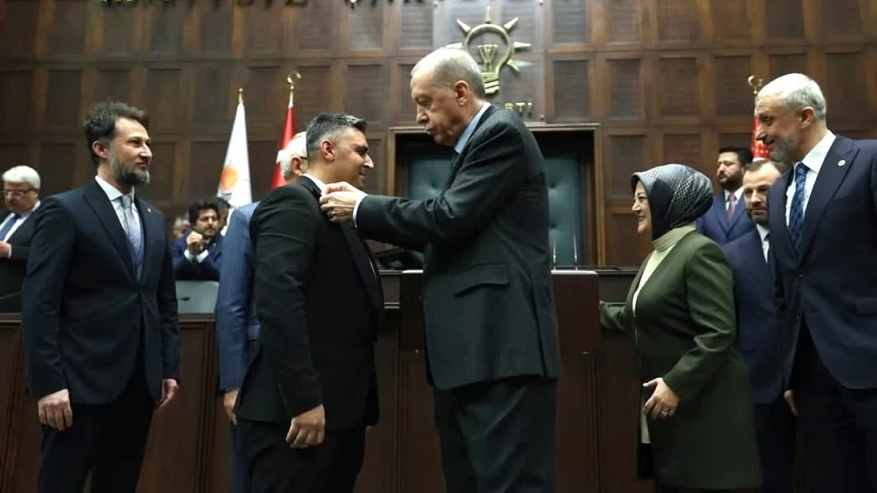 Cumhurbaşkanı Recep Tayyip Erdoğan, partisinin TBMM grup toplantısına katılan ve AK Parti'ye geçen Kütahya'nın Gediz ilçesi Yenikent Beldesi Belediye Başkanı Cumali Öztürk'e rozet taktı.