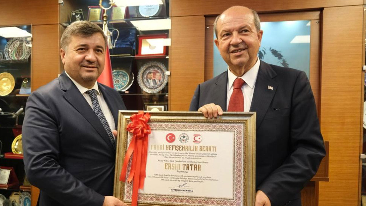 Giresun Belediyesi’nin davetlisi olarak Giresun’a gelen Kuzey Kıbrıs Türk Cumhuriyeti Cumhurbaşkanı Ersin Tatar’a “Fahri Hemşehrilik” beratı sunuldu.