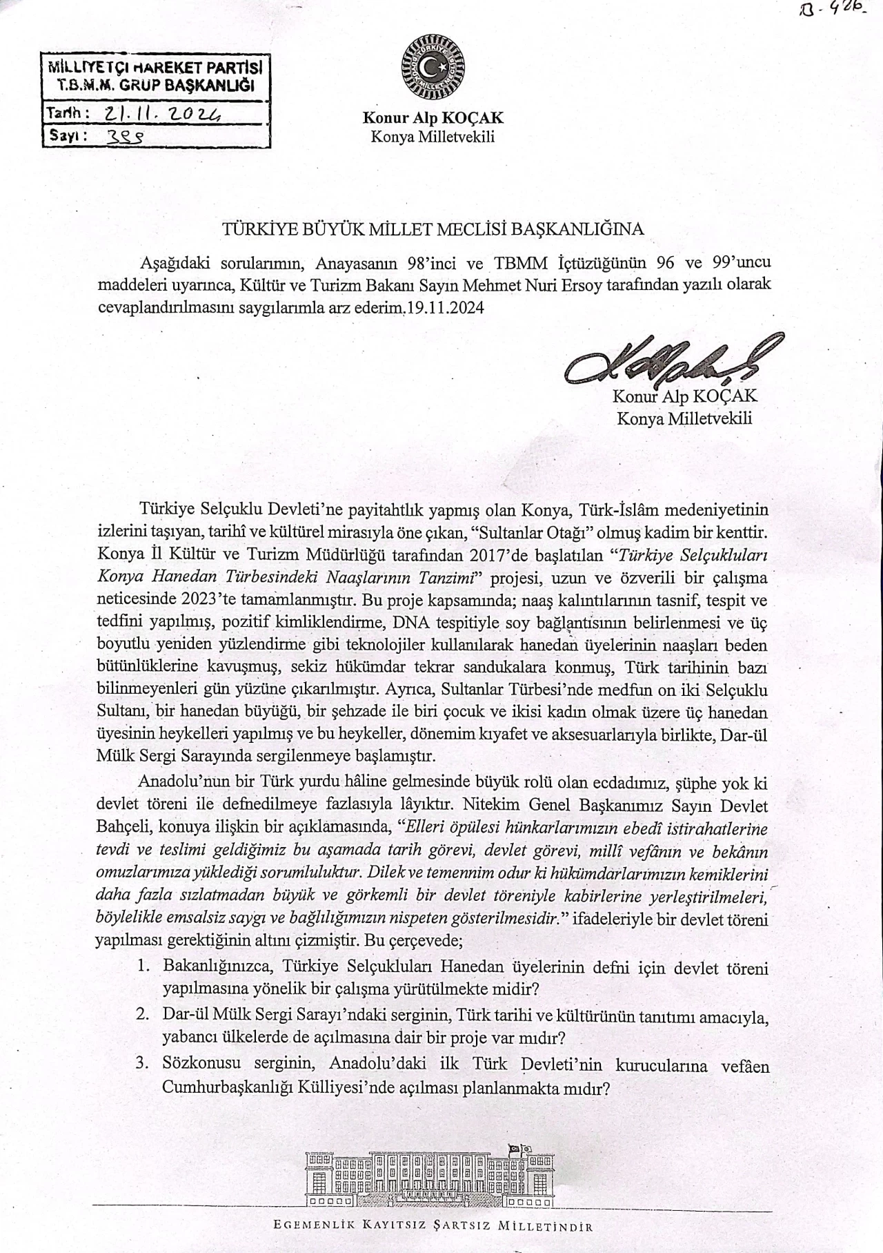 MHP Milletvekili Konur Alp Koçak, Türkiye Selçuklu Devleti’ne payitahtlık yapmış olan Konya’nın tarihî ve kültürel mirasına sahip çıkılması için önemli bir adım attı. Koçak, Kültür ve Turizm Bakanlığına yönelttiği soru önergesiyle Konya’da medfun Selçuklu Sultanları için devlet töreni yapılması önerisini yineledi. Bu teklifin daha önce MHP Genel Başkanı Devlet Bahçeli’nin gündeme getirdiğini hatırlatan Koçak, “Anadolu’nun bir Türk yurdu hâline gelmesinde büyük rolü olan ecdadımız, devlet töreni ile defnedilmeye fazlasıyla lâyıktır.” dedi.