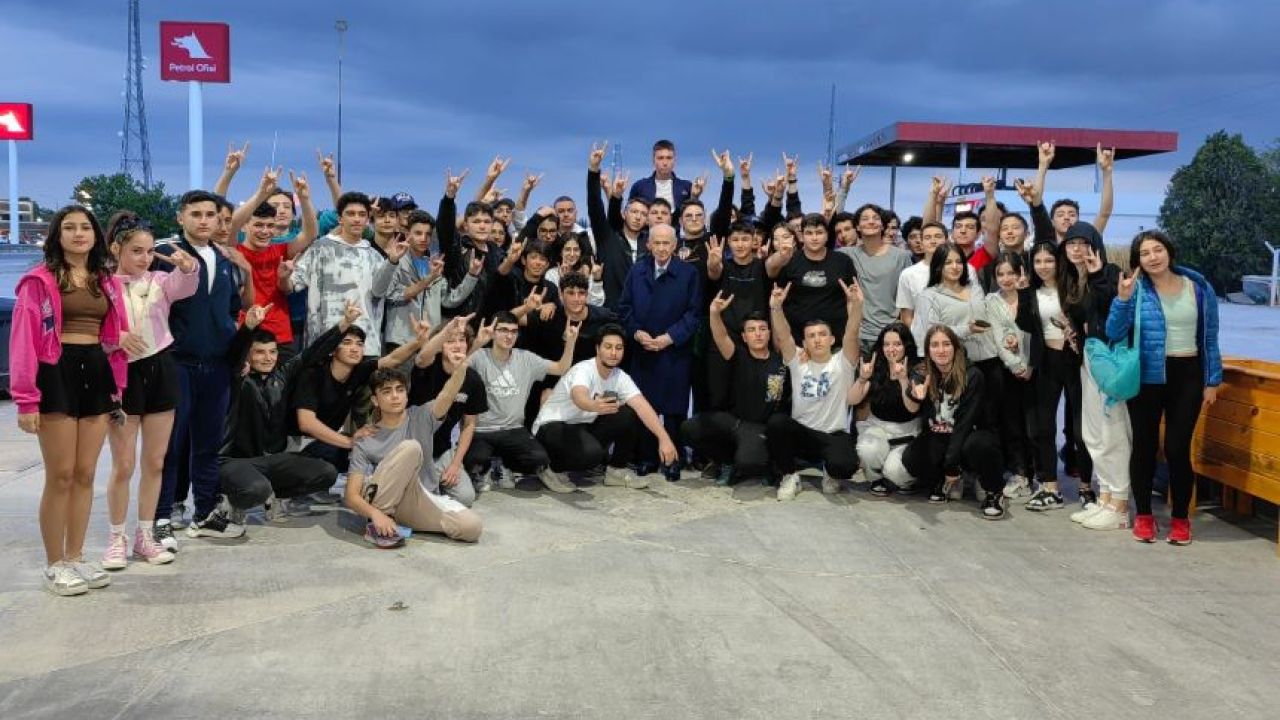 MHP Lideri Bahçeli Miting Gezileri esnasında genç öğrencilerle tesadüfen karşılaştı. Gençlerle bir araya gelen Bahçeli toplu fotoğraf çektirirken ortaya oldukça güzel bir sahne çıkmış oldu. Lider Bahçeli fotoğraf çekiminin ardından umudumuz olan gençlerimizi tebrik edip başarılar diledi..