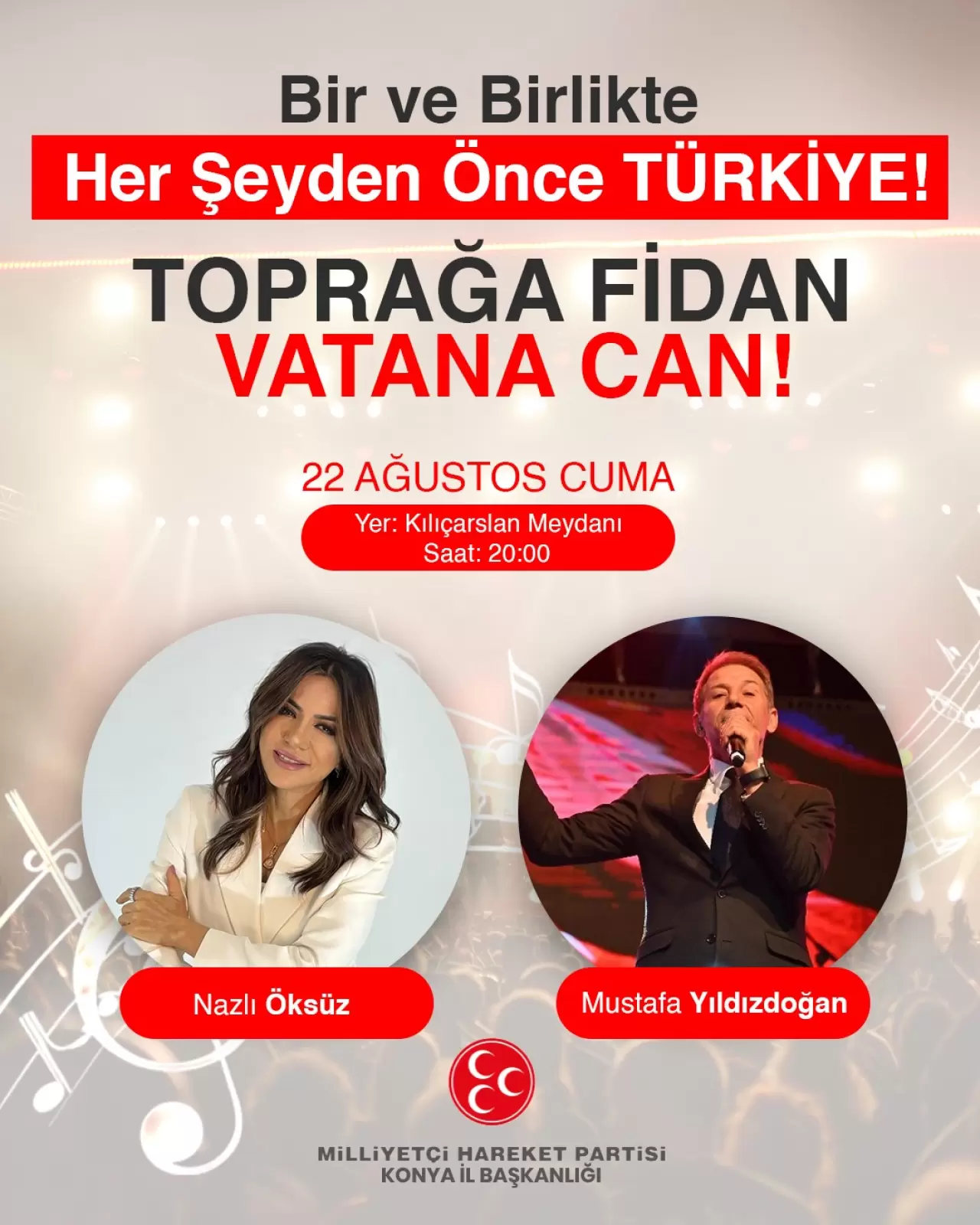 Bu ağaçlandırma etkinliğimizden haberdar olan çok değerli iki sanatçımız Konyalı hemşerimiz Sayın Mustafa Yıldızdoğan ve Nazlı Öksüz hanımefendi de etkinliğimize destek vermek arzusuyla alanda yer alarak türküleri ve şarkıları ile etkinliğimize destek vereceklerdir. Kendilerine bu vesileyle tekrar teşekkürlerimi sunuyorum. Onların sesi, Kılıçarslan Şehir Meydanı’nda yükselirken; biz sadece türküler ve şarkılar dinlemeyeceğiz, aynı zamanda “Huzurlu ve yeşil bir Türkiye” hayalini hep birlikte haykıracağız. “Bir ve Birlikte Her Şeyden Önce TÜRKİYE!” olacağız. Bu organizasyonun merkezinde, birleşmek, üretmek ve yeşertmek var. Böylesine zor ve karmaşık zamanlarda, vatanımızın her bir ferdi olarak bir araya gelmek zorundayız.