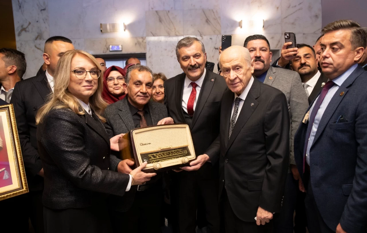 "MHP TBMM Grup Toplantısı sonrasında Saygıdeğer Genel Başkanımız Devlet Bahçeli’ye Nevşehir heyeti olarak, 1963 yılı yapımı antika radyoyu; bir tablo içinde birlenmiş Bektaşi tacı, teslim taşı ile bağlama minyatürünü ve Avanos ilçemizde ilk kez Üç Hilal’i dalgalandırmamızdan dolayı Avanos’un altın kaplama anahtarını zat-ı âlilerine takdim ettik.”