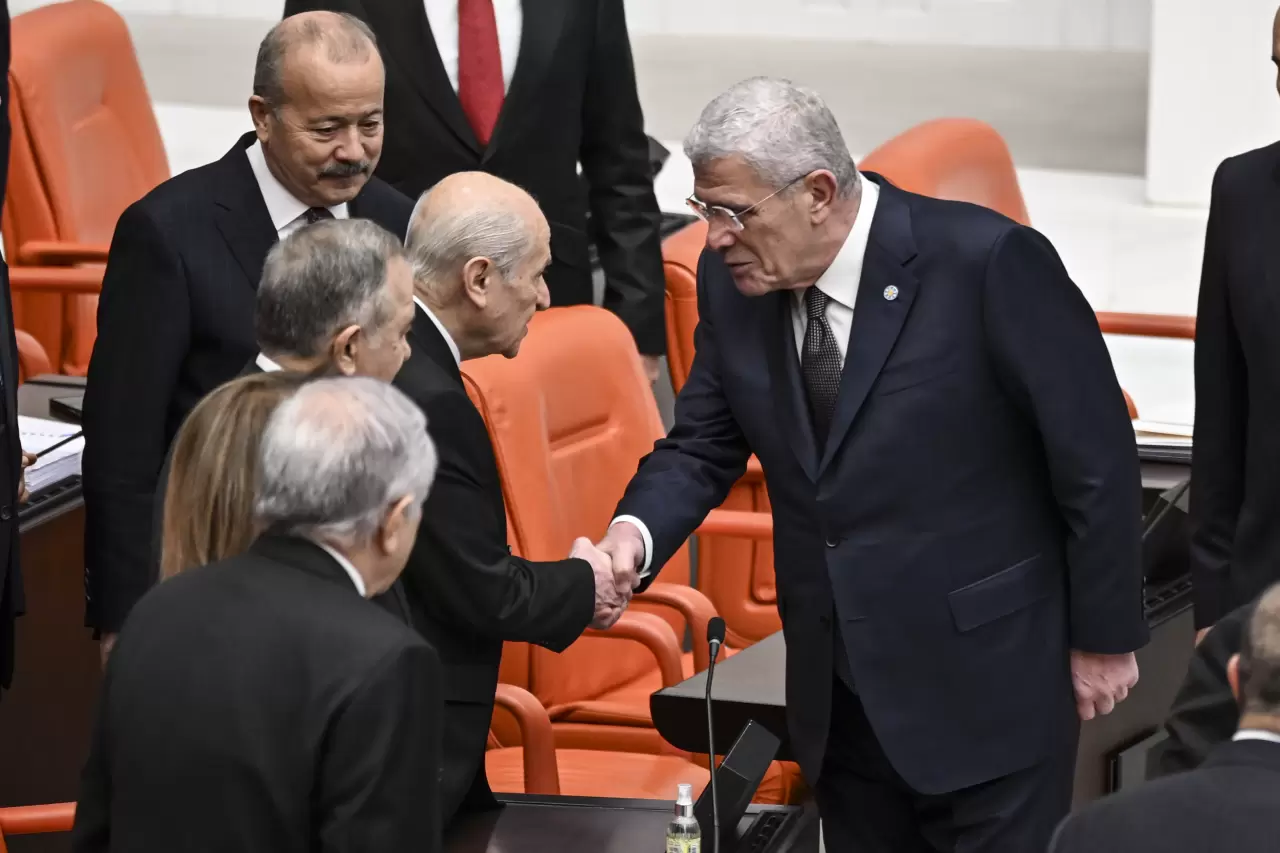MHP Genel Başkanı Devlet Bahçeli ile İP'li Müsavat Dervişoğlu selamlaştı.