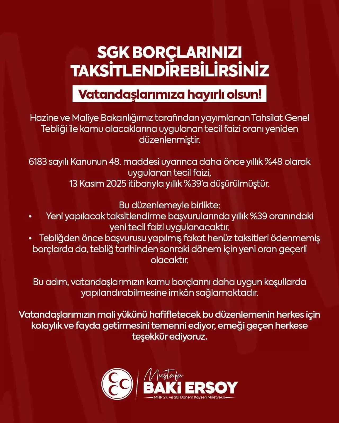Milliyetçi Hareket Partisi (MHP) Kayseri Milletvekili Baki Ersoy, Hazine ve Maliye Bakanlığı tarafından yayımlanan Tahsilat Genel Tebliği ile kamu alacaklarına uygulanan tecil faiz oranında indirime gidildiğini duyurdu.
