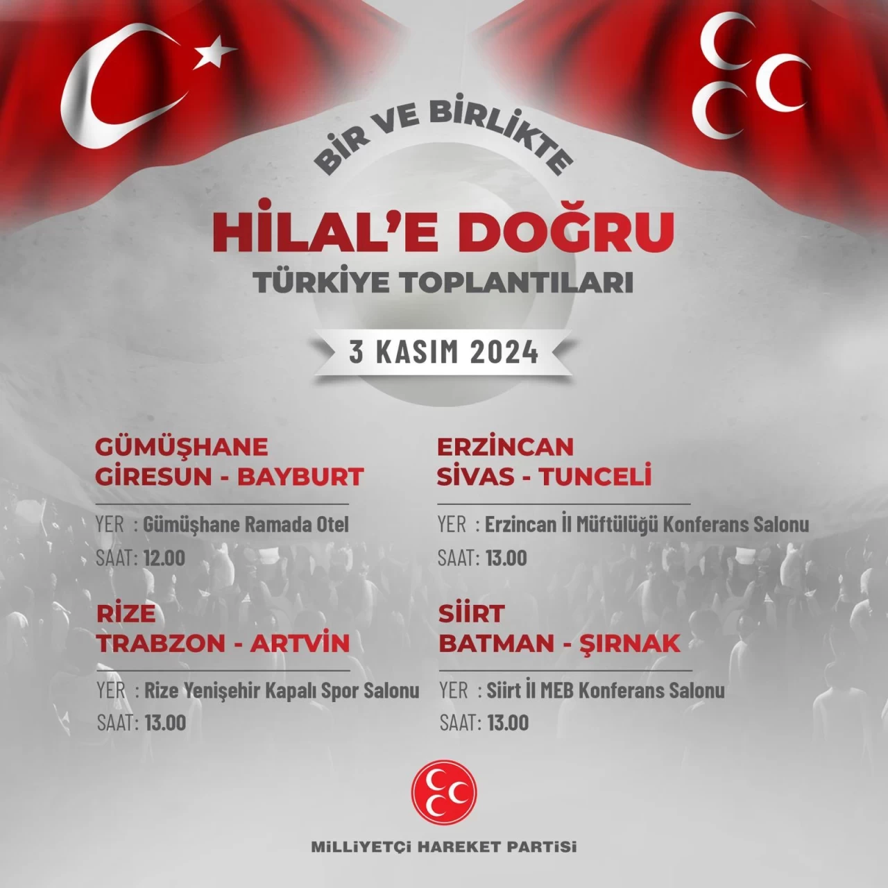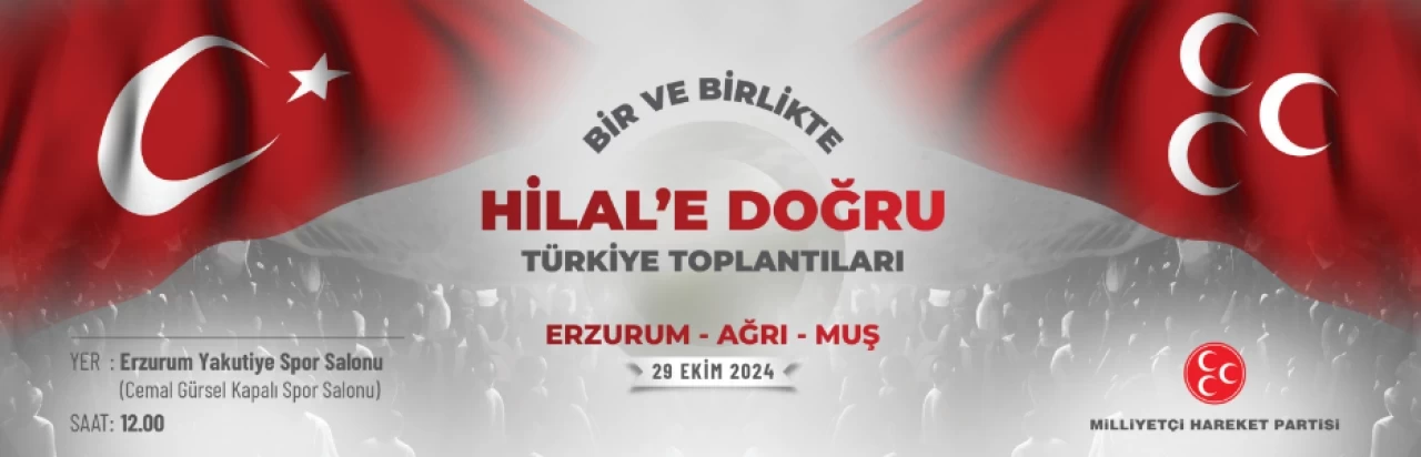 MHP’nin 27 bölgede düzenleyeceği “Bir ve Birlikte Hilal’e Doğru Türkiye” toplantılarının ilki, Cumhuriyet Bayramı’nda, 29 Ekim 2024’te Erzurum’da gerçekleştirilecek. Erzurum Yakutiye Spor Salonu’nda saat 12.00’de başlayacak bu ilk toplantıya, Ağrı ve Muş teşkilatları da katılım sağlayacak.
