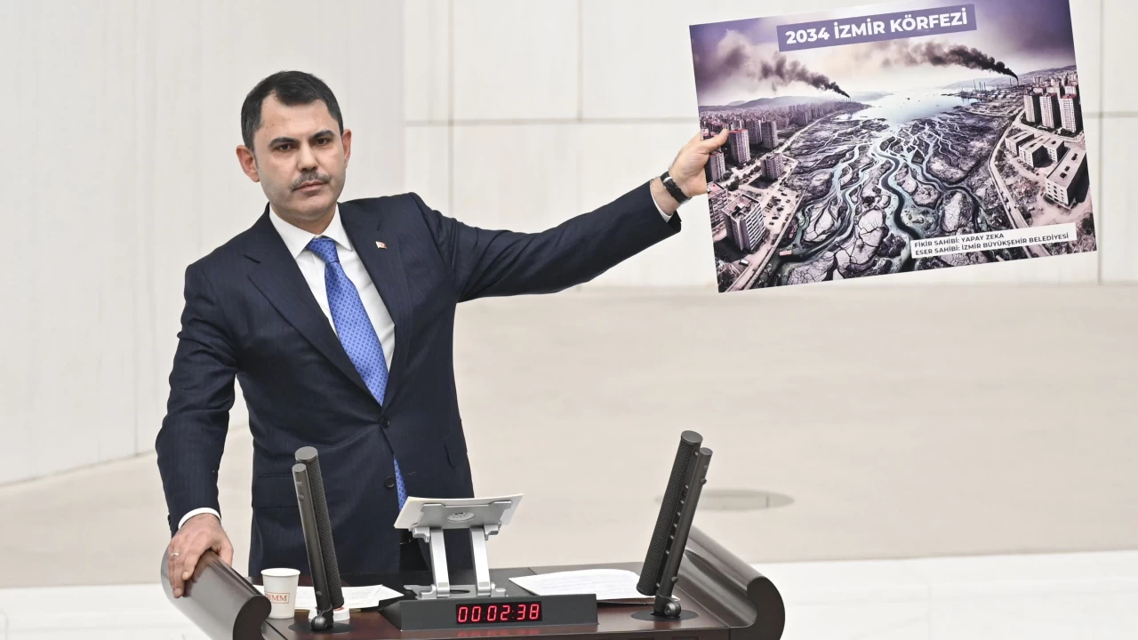 İzmir Körfezi'ne yönelik olarak Kurum, “Bakanlık olarak hemen bölgede incelemelerimizi tamamladık. İzmir Körfezi bilim kurulumuzu oluşturduk. 15 maddelik acil eylem planını ortaya koyduk. Plan Bütçe Komisyonu'nda körfezden geçirdiğimiz suyu gösterdiğimiz anda heyecan anları gördük. Orada su getirdiğimiz için maalesef vekillerimizin bu noktada ellerinin ayaklarını karıştığına şahitlik ettik. Ama sakin olun. Rahat olun. Bu sefer yanımda bir fotoğraf getirdim. 2034 yılına ait bir fotoğraf. İzmir Körfezi. Sayın Özgür Özel yapay zekayla adaylarımızı belirliyoruz. Biz de yapay zekanın belirlediği adayların yönettiği belediyeleri soralım dedik.