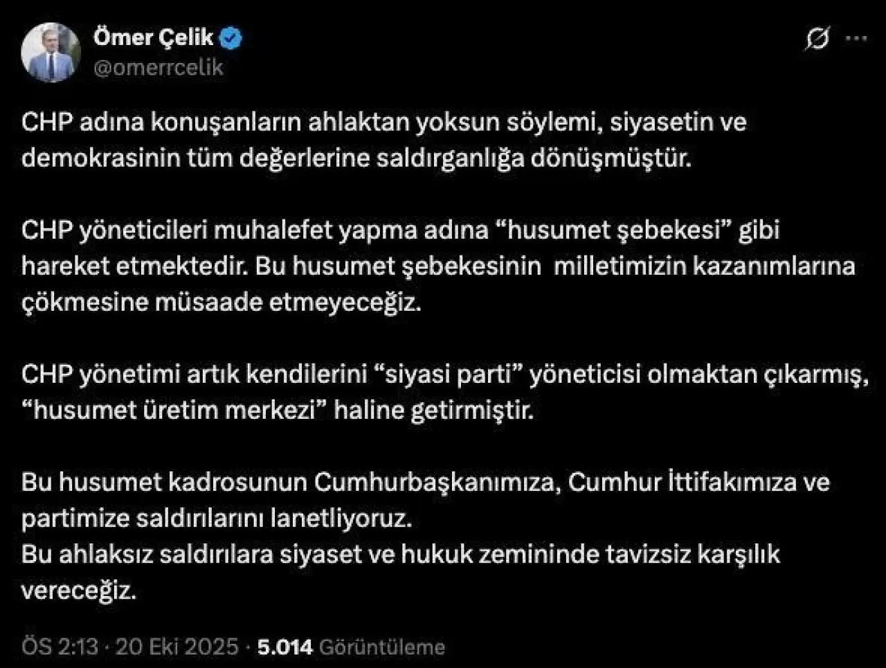 AK Parti Sözcüsü Ömer Çelik, sosyal medya platformu X'teki hesabından yaptığı paylaşımda, Cumhuriyet Halk Partisi (CHP) yönetimine yönelik sert eleştirilerde bulundu.