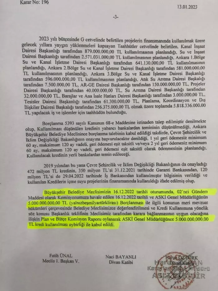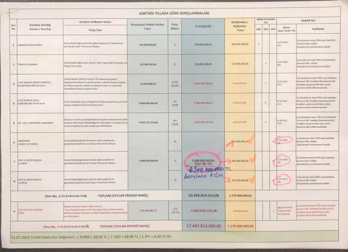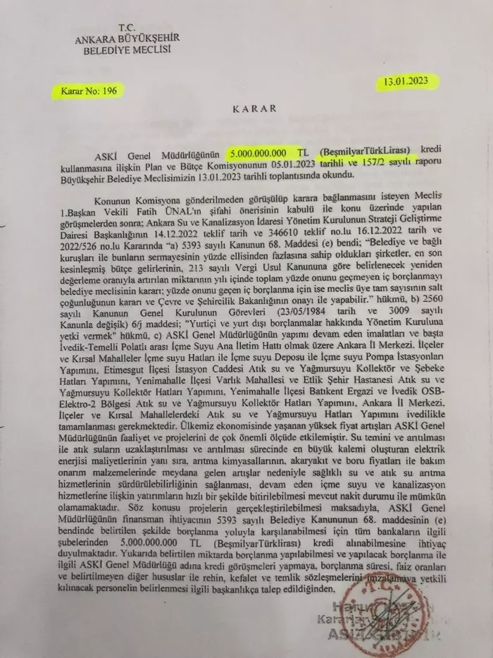 "07 Temmuz 2022 tarih ve 1412 sayılı meclis kararı ile 63 milyon Euro yani 1 milyar 795 milyon 500 bin TL borçlanma yetkisi almış. Yine 07 Temmuz 2022 tarihli ve 1413 sayılı meclis kararı ile 6 milyar Japon Yeni yani 1 milyar 200 milyon TL'lik yetki alınmış. Yetmemiş 14 Haziran 2022 tarihli 1276 sayılı meclis kararı ile 'Ankara su temin projesi (Gerede) finansmanı kapsamında kalan kredinin ASKİ Genel Müdürlüğünün (Çamlıdere ve Beypazarı su temin projeleri) iki adet projesi için kullanılması üzere 9 milyar 956 milyon 772 bin 774 Japon Yeni TL karşılığı ise 1 milyar 991 milyon 354 bin 554 TL borçlanma yetkisi alınmış.