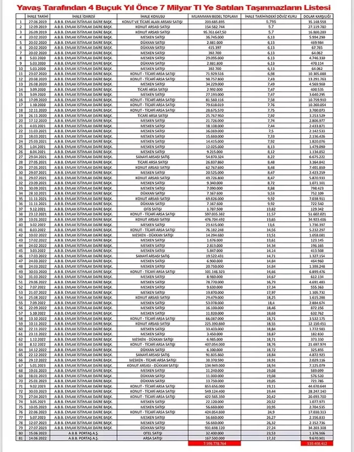 4 buçuk yılda Ankara'ya tek bir çivi çakılmadığını vurgulayan Özcan, "Ankara parsel parsel satıldı. Yavaş 2019 yılından beri 81 kez toplu arsa/bina satışına çıkıp yüzlerce arsa ve bina sattı. Bu sattığı taşınmazların toplam satış bedeli 7 milyar 598 milyon 778 bin 764 TL'dir. Dolar bazında bu rakam 539 milyon 408 bin 412 dolar ediyor.