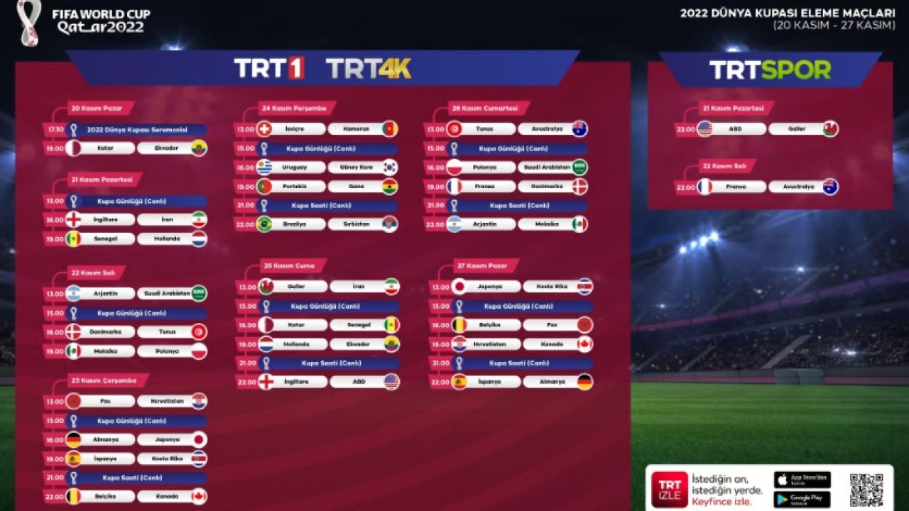 20 Kasım Pazar (yarın) günü başlayacak 2022 FIFA Dünya Kupası maçları TRT’den canlı yayınla ekranlara gelecek. Futbolun bir numaralı organizasyonu, Türkiye sınırları içinde TRT 1, TRT Spor ve TRT 4K kanalı ile TRT İzle dijital platformundan takip edilebilecek.