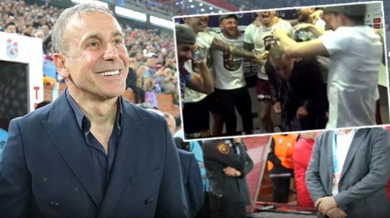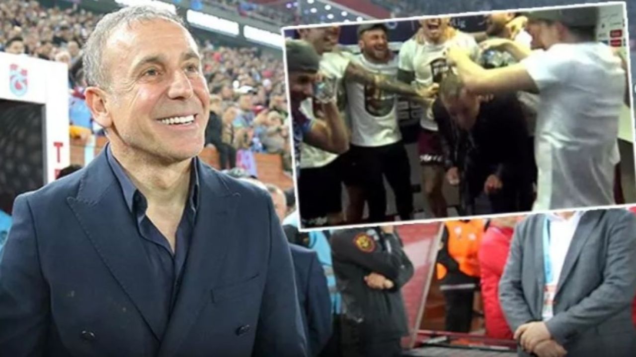 Trabzonsporlu oyuncular, Avcı'nın röportajına su şişeleriyle baskın yaptı. Tecrübeli teknik adam kutlama esnasında sırılsıklam oldu.