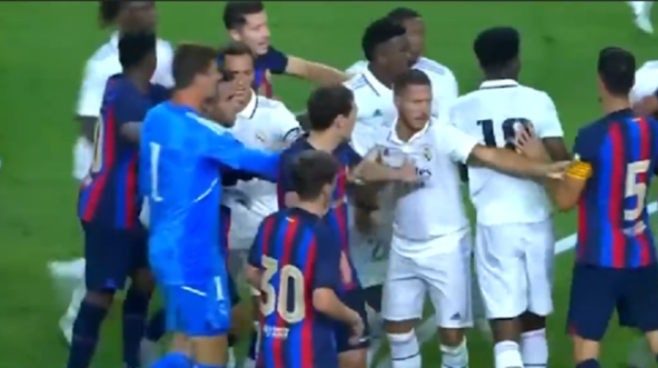 Barcelona'nın maçı 1-0 önde götürdüğü karşılaşmanın 42. dakikasında Vinícius Júnior'a yapılan sert faul sonrası oyuncular birbirine girdi.