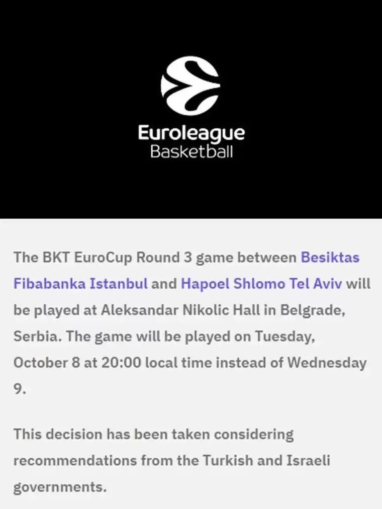 EuroCup, Beşiktaş Erkek Basketbol Takımı ile İsrail temsilcisi Hapoel Shlomo Tel Aviv arasında İstanbul'da oynanması planlanan karşılaşmanın Belgrad'a alındığını açıkladı. Müsabaka, 8 Ekim Salı günü saat 20.00'de Aleksandar Nikolic Salonu'nda yapılacak.